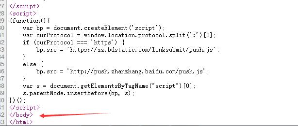 在这里,优化师把主动推送代码加入在</body>上方,其主要目的是为了让这个代码起到推送整站的目的!