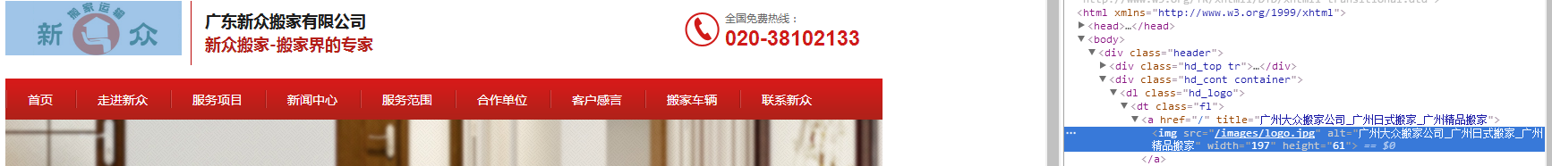网站logo的alt标签和title标签都是调取的首页TDK里面的标题部分,这个需要修改下因为标签只能体现出一个关键词来而不是几个随意填写的,我们把alt标签关键词设置为广州大众搬家公司然后在加上logo的H1标签注释让百度知道这个的重要性。